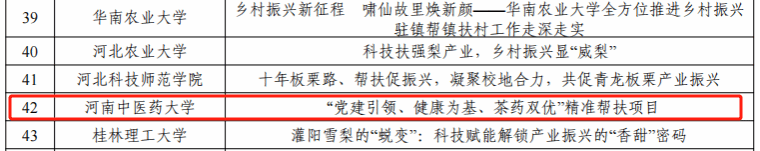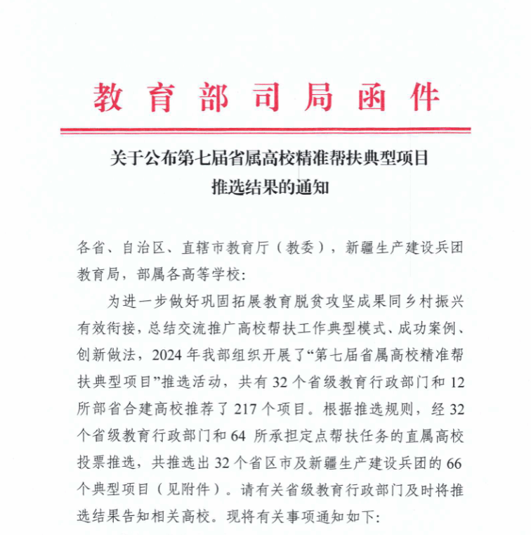 本网讯(文/图 范涛)近日,教育部第七届省属高校精准帮扶典型项目推选结果公布,我校申报的《党建引领、健康为基、茶药双优》项目成功入选全国典型案例。据悉,为进一步做好巩固拓展教育脱贫攻坚成果同乡村振兴有效衔接,统筹乡村教育振兴和教育振兴乡村,教育部组织开展省属高校精准帮扶典型项目推选活动,共有32个省级教育行政部门和12所部省合建高校推荐了217个项目。根据推选规则,经32个省级教育行政部门和64所承担定点帮扶任务的直属高校投票推选,共推选出32个省区市及新疆生产建设兵团的66个典型项目,河南省共有2所高校入选,我校是其中之一。